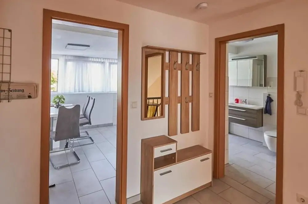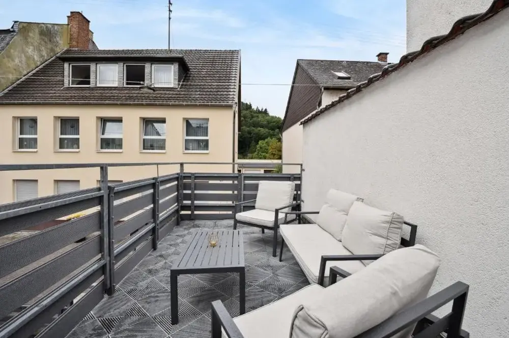Weitere Informationen zu FeWo FerberFerienwohnung-Malander in Andernach bietet geräumige Unterkünfte mit einem Schlafzimmer und Wohnzimmer sowie einer Terrasse und einem Balkon mit Bergblick. Die moderne Ausstattung umfasst kostenlose WLAN-Zugang, eine kleine Küche, eine Waschmaschine und zusätzliche Einrichtungen wie Bademäntel, Essbereich und ein Sofa-Bett.