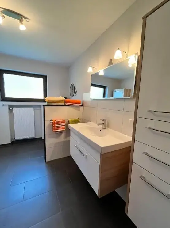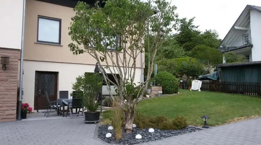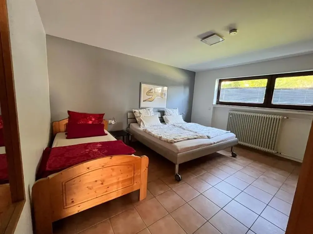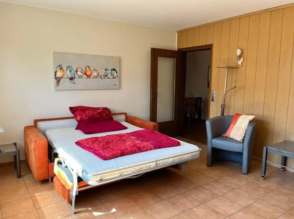 Ferienwohnung Pint in Bickendorf ist eine geräumige Unterkunft mit einem Schlafzimmer und Wohnzimmer sowie modernen Ausstattungsmerkmalen. Die Wohnung befindet sich im Erdgeschoss und verfügt über eine Terrasse mit Gartenblick. Gäste profitieren von einer vollständig eingerichteten Küche, kostenlosem WLAN und einer Außenliege.