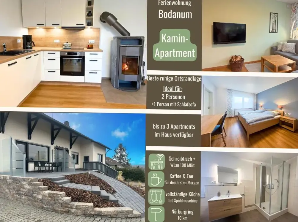 Weitere Informationen zu Kamin-Apartment Bodanum mit eigener Terrasse - naturnahe Ortsrandlage - VDSL - 10 min zum NürburgringDas Familien-Apartment Bodanum bietet Platz für vier Personen und liegt in einer naturnahen Randlage des Ortes. Die Wohnung verfügt über eine eigene Terrasse sowie einen Arbeitsplatz mit schnellem Internetanschluss (VDSL). Ideal für Besucher des Nürburgrings, der rund zehn Minuten entfernt ist. Das Apartment punktet durch moderne Ausstattung und ausreichend Raum, wie Gäste in Bewertungen betonen.