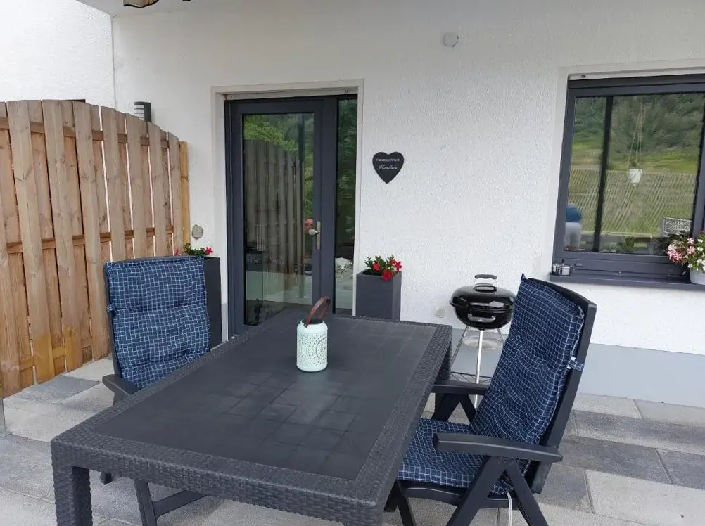 Die Ferienwohnung Moselliebe in Lehmen bietet eine modern ausgestattete Unterkunft mit einer sonnenüberdachten Terrasse und freiem WLAN. Die Wohnung im Erdgeschoss verfügt über eine Kochnische, einen Essbereich sowie einen privaten Eingang. Ausblick auf Gärten, Berge und den Fluss lässt sich von der Terrasse genießen.