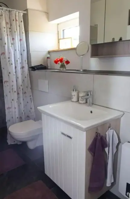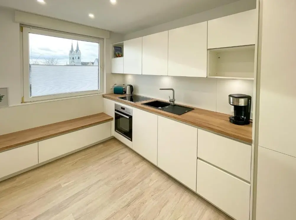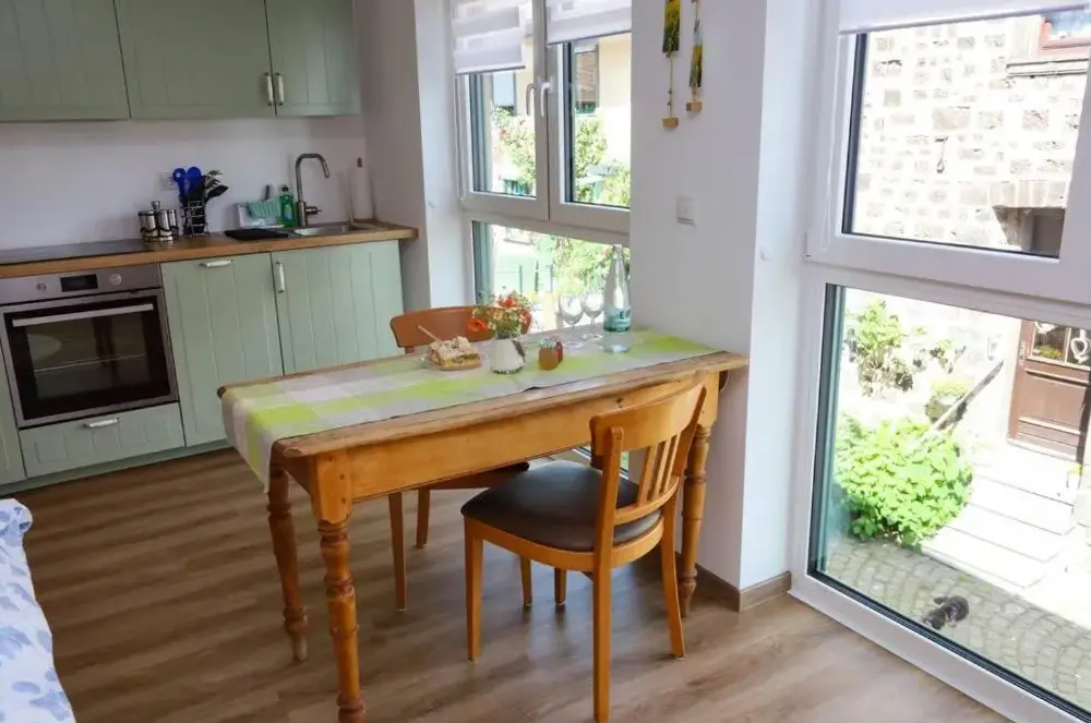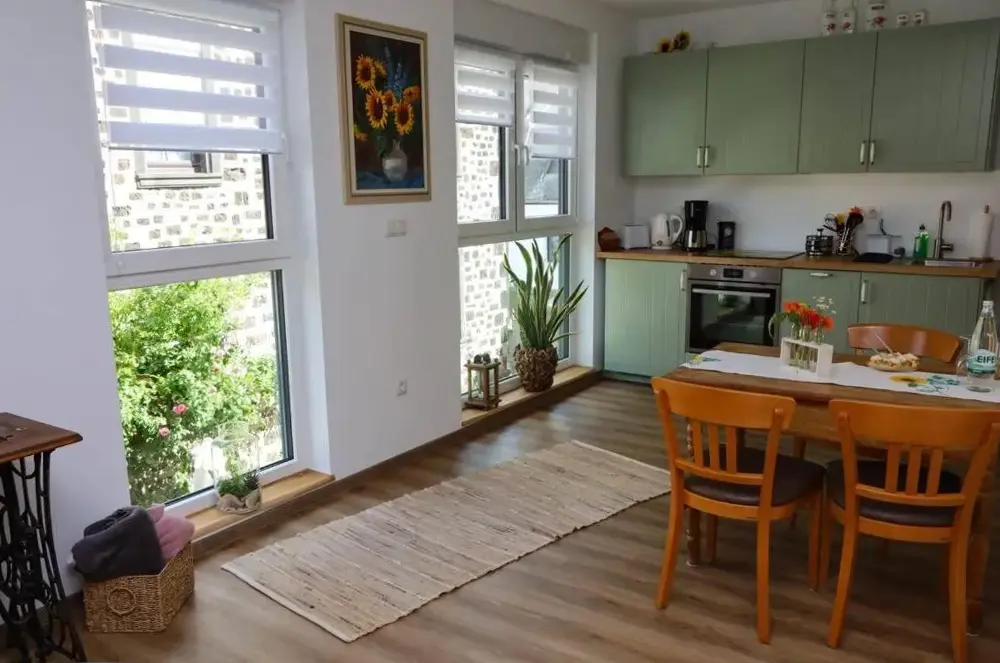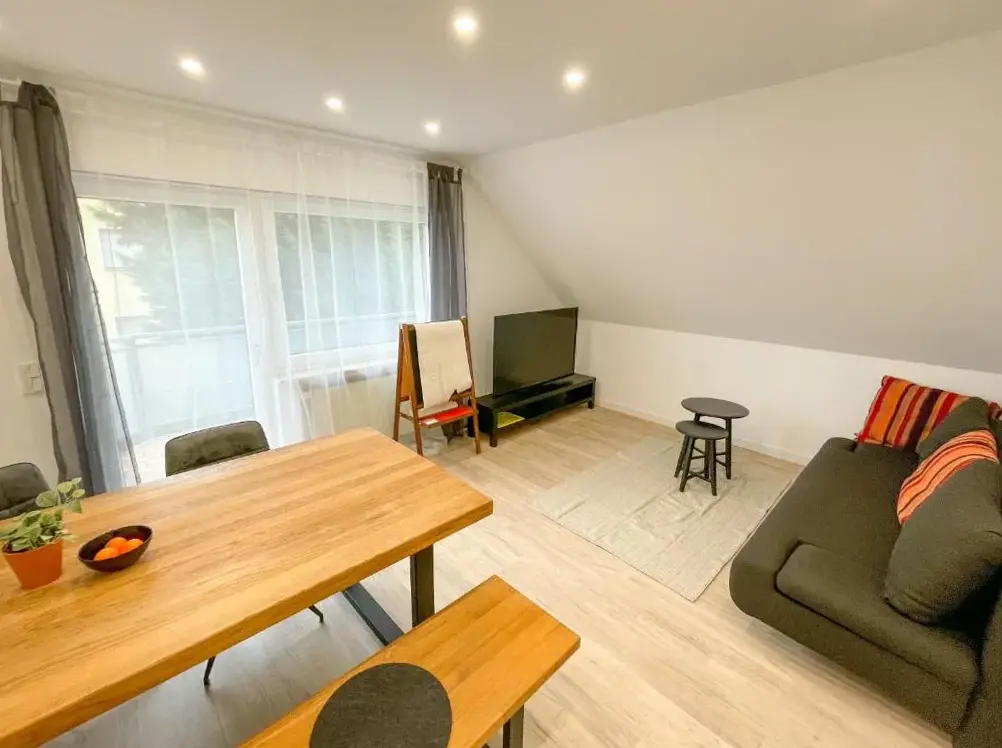 Weitere Informationen zu Ländliches Apartment SonnenblumeFerienwohnung Ida in Polch bietet geräumige Unterkünfte mit zwei Schlafzimmern und einem Wohnzimmer. Die Wohnung verfügt über eine Terrasse sowie einen Balkon mit Blick auf den Garten und die Stadt. Moderne Ausstattung umfasst eine Küchenzeile, eine vollständig eingerichtete Küche und freies WLAN.